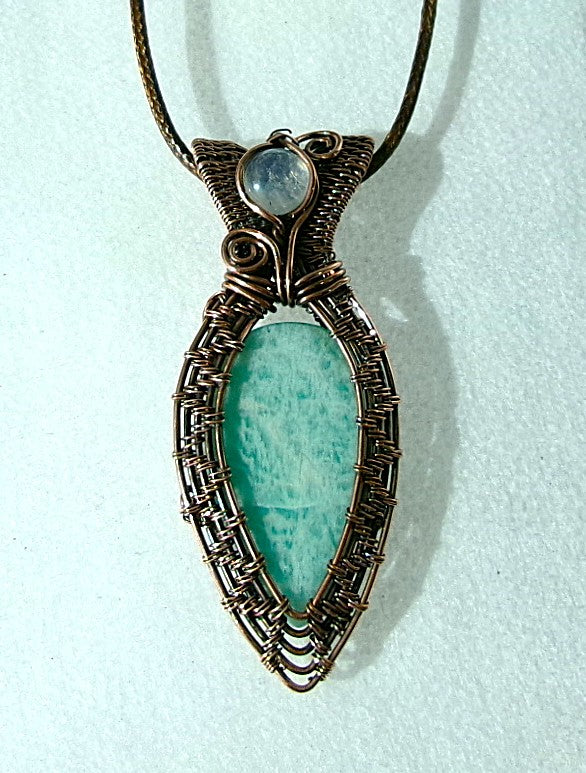 Amazonite gemstone copper wire wrapped crystal pendant with rainbow moonstone bail stone
