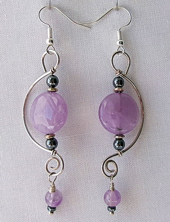 Amethyst silver filled wire earrings with hematite, silver, and amethyst accent beads