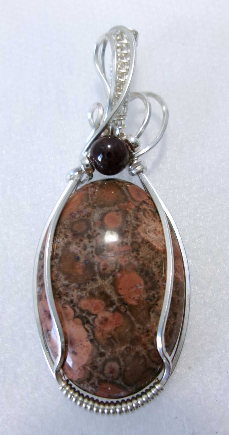 Pendant is oval shaped is wrapped in sterling silver wire and accented with garnet and sterling silver beads.