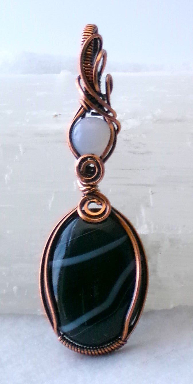 Black Agate and Blue Chalcedony gemstone copper wire wrapped double crystal pendant