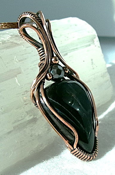 Pendant is wrapped in pure copper wire that has been oxidized for an antique look and measures 2 3/8” tall x 1” wide.