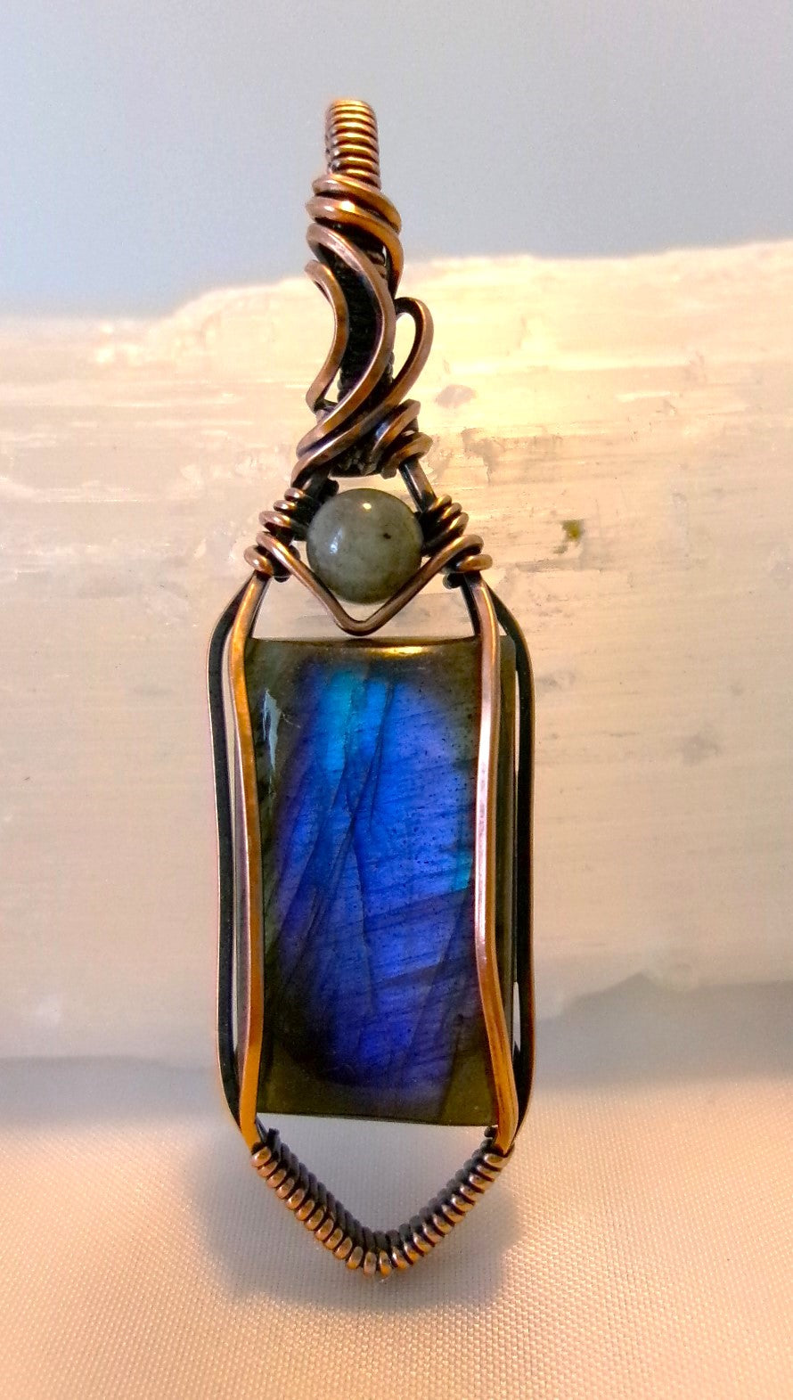 Labradorite gemstone copper wire wrapped crystal pendant with gray labradorite accent bead