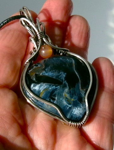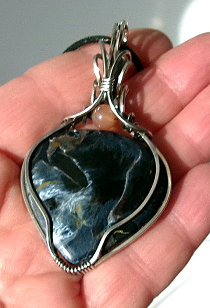 Pietersite gemstone sterling silver wire wrapped crystal pendant with apricot Botswana agate accent bead