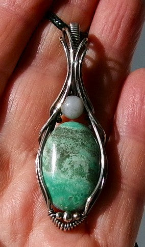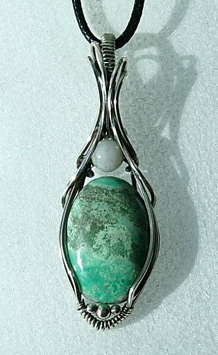 Variscite gemstone sterling silver wire wrapped crystal pendant with snow quartz and sterling silver accent beads